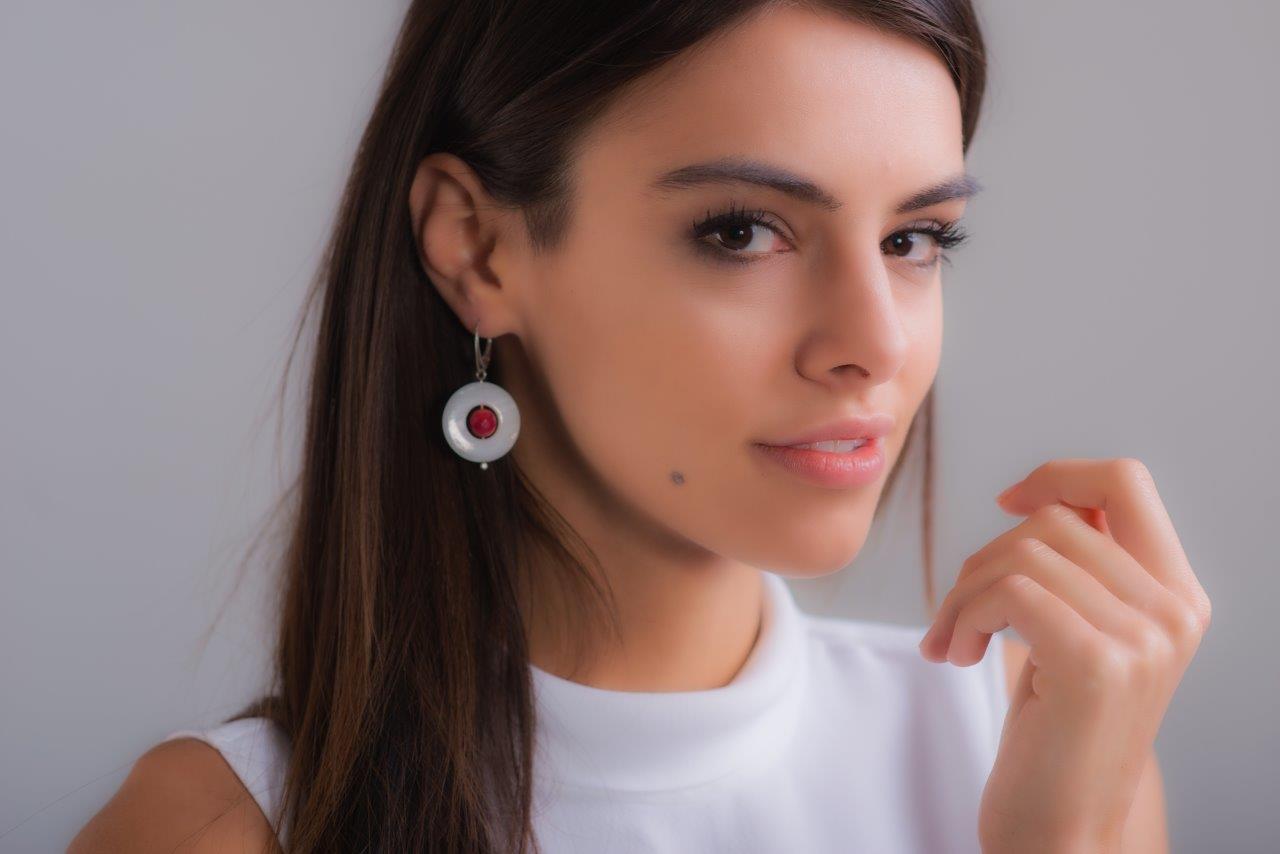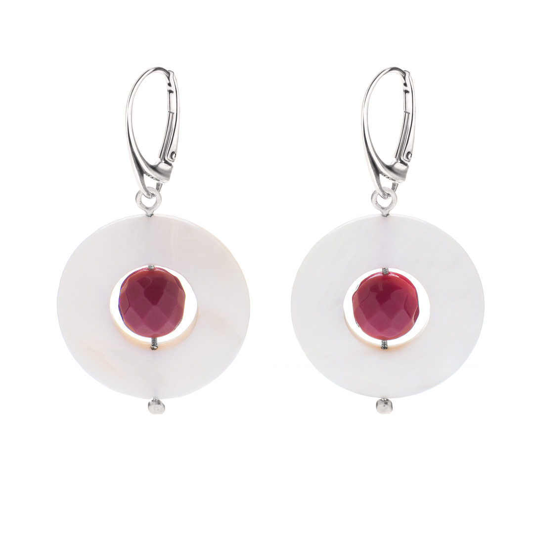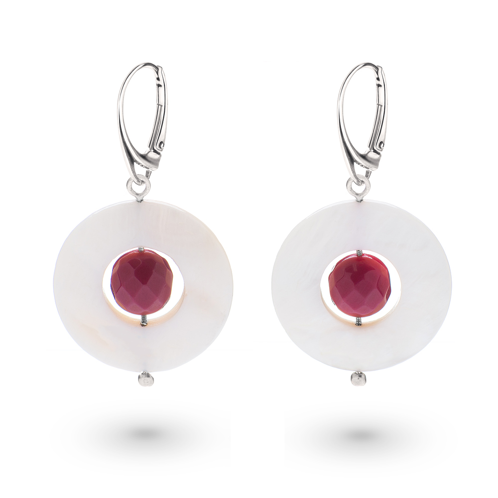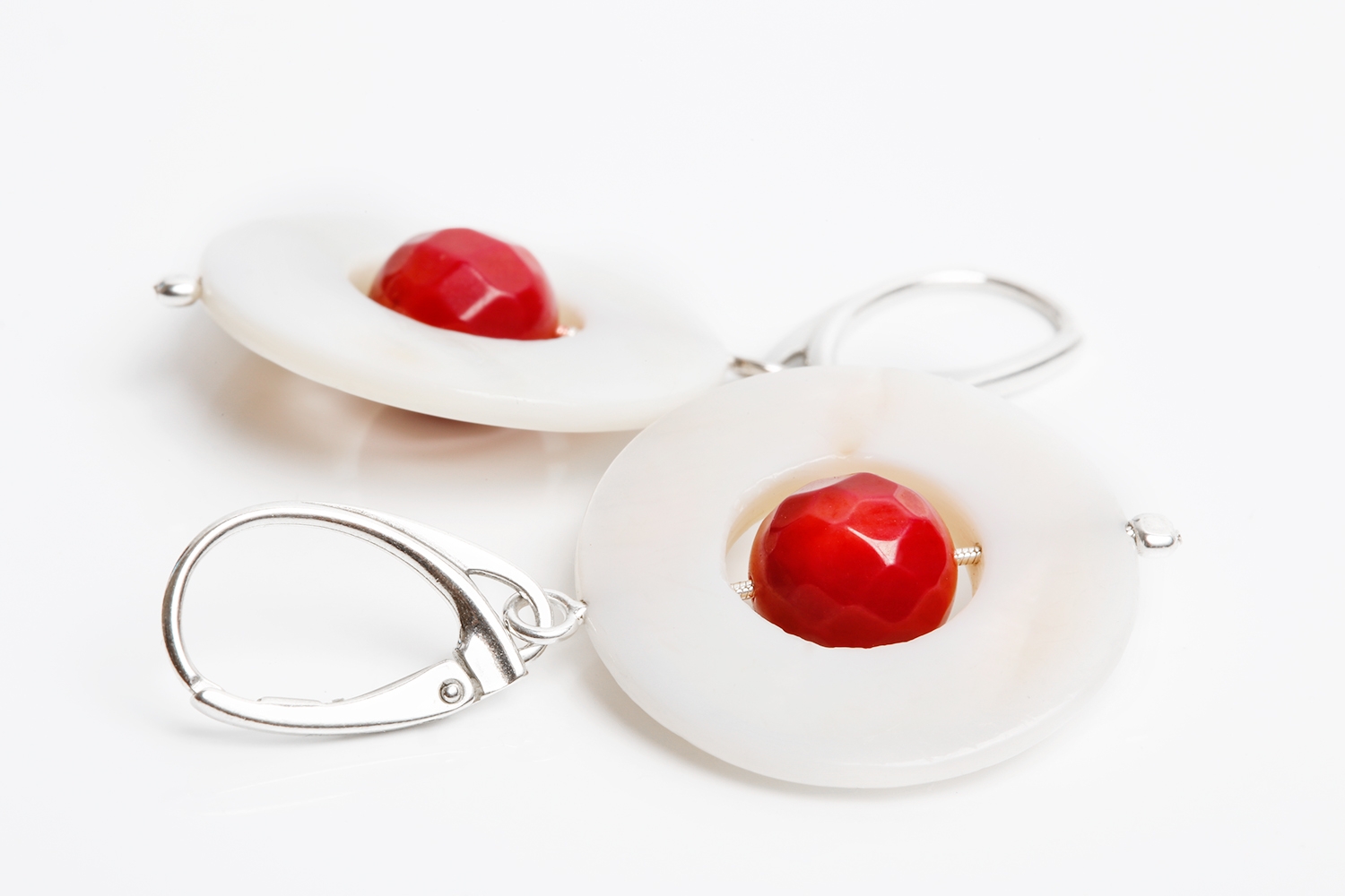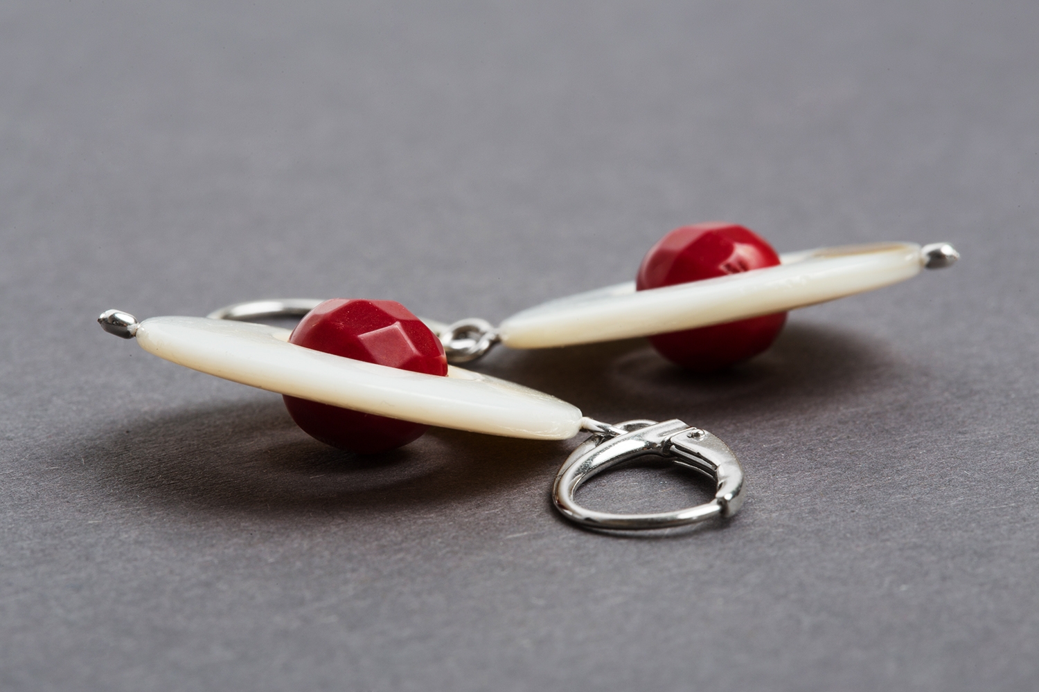 Niebanalna kompozycja składająca się z dysku białej masy perłowej, czyli wewnętrznej warstwy muszli i fasetowanego korala. Całość, wraz z biglami, zawieszona na srebrze próby 925. Tym lekkim kolczykom nadałam japońskie imię Seiko.