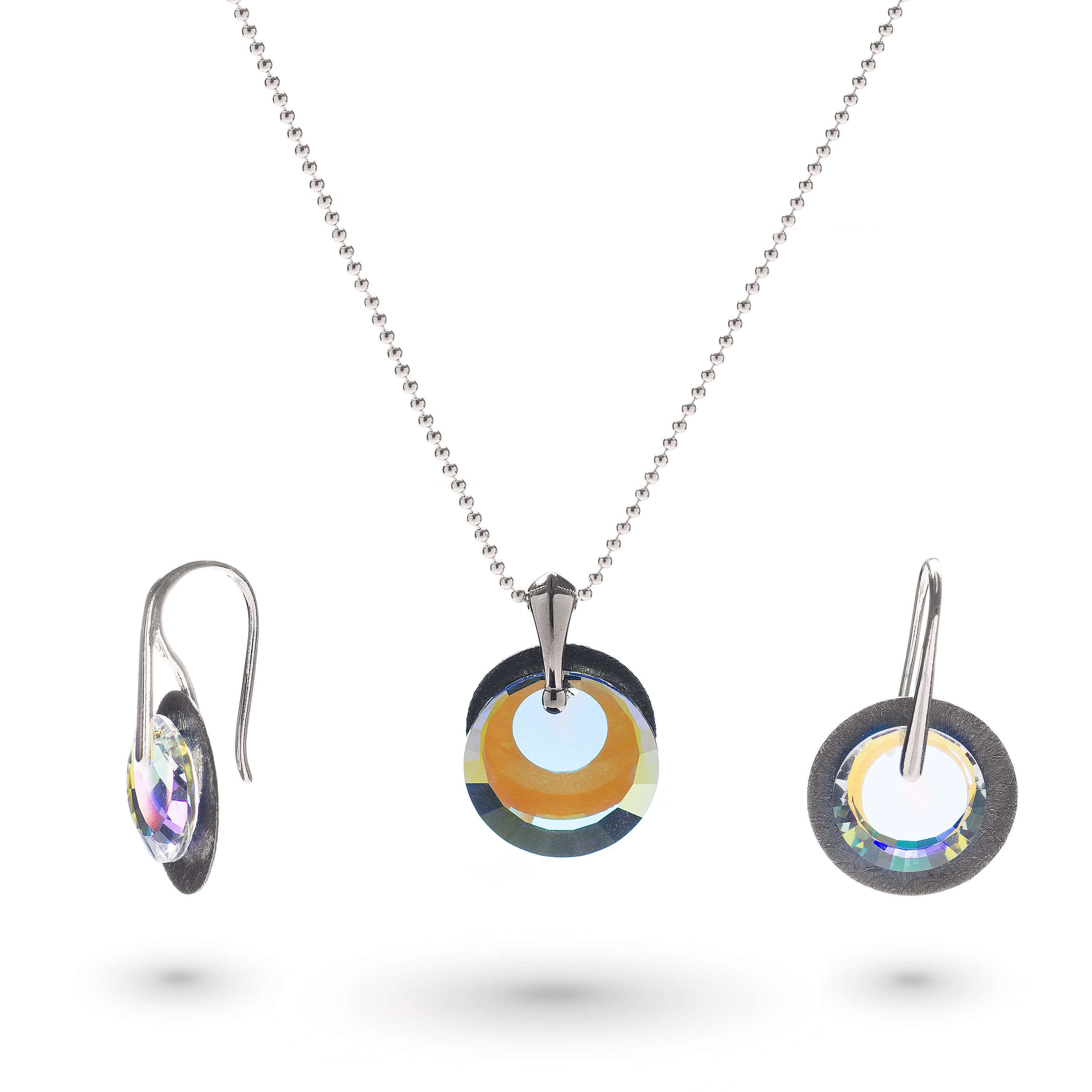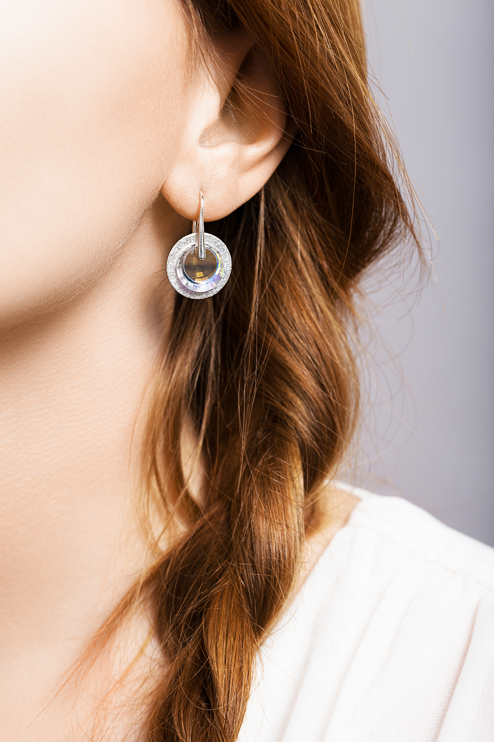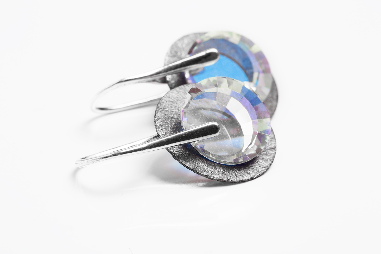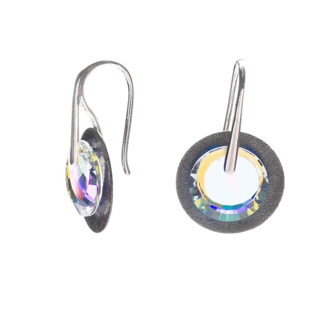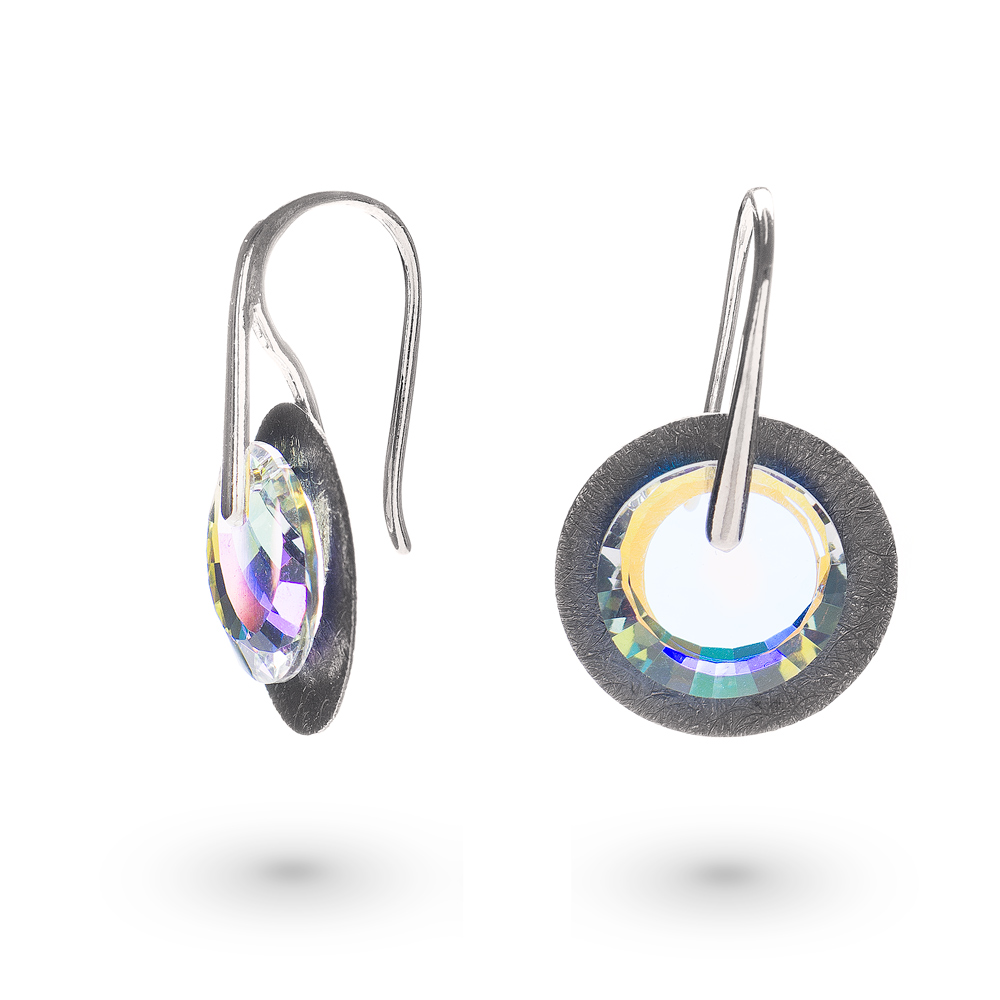 Ekskluzywne kolczyki z kryształowym krążkiem Swarovski AB oraz srebrnym, oksydowanym, płaskim krążkiem próby 925. Kryształ odbija refleksy światła i pięknie prezentuje się na uchu. Eleganckie i unikatowe. Wersja z oksydowanym krążkiem lepiej prezentuje się na kobietach o jasnych włosach. Zwróć także uwagę na model Sunshine.