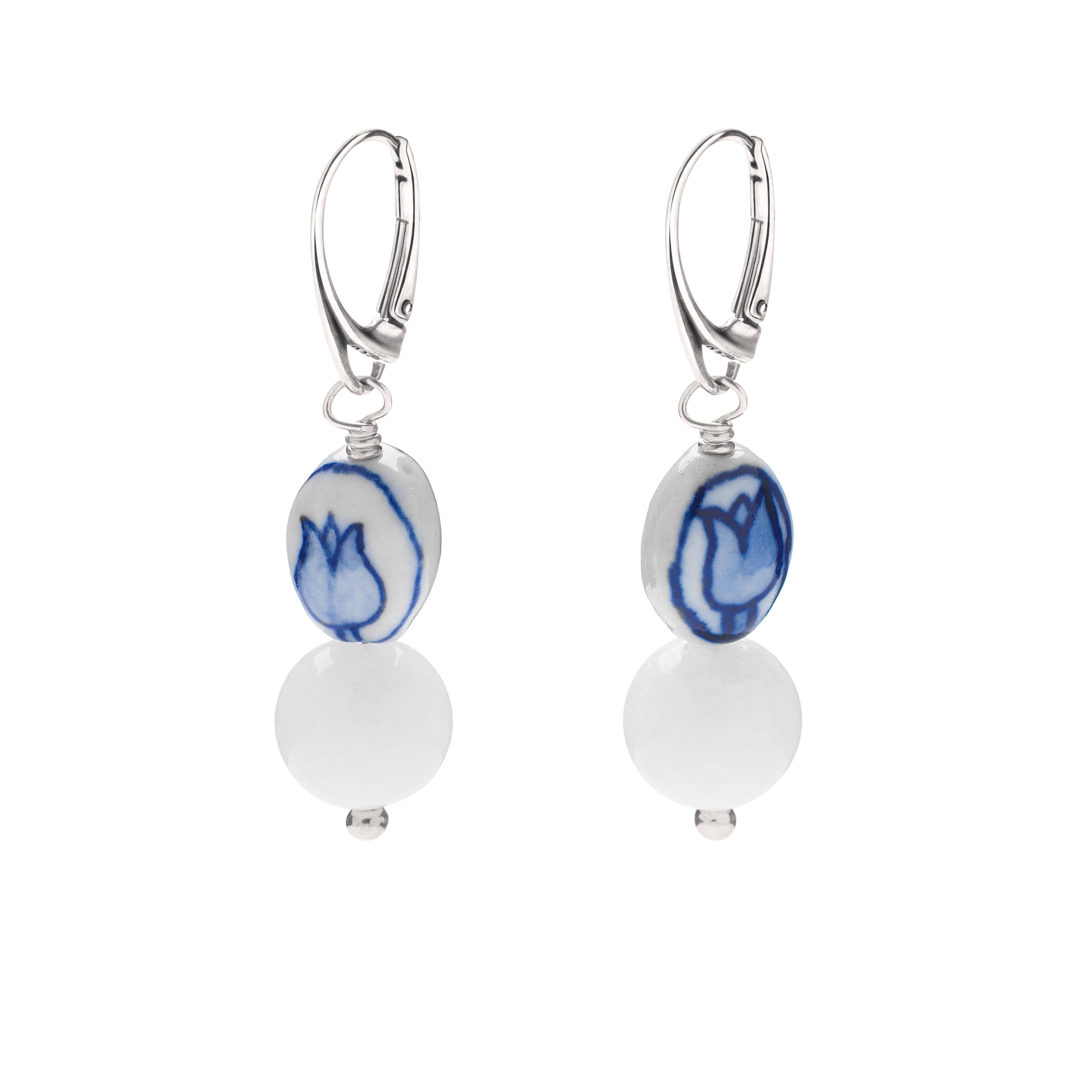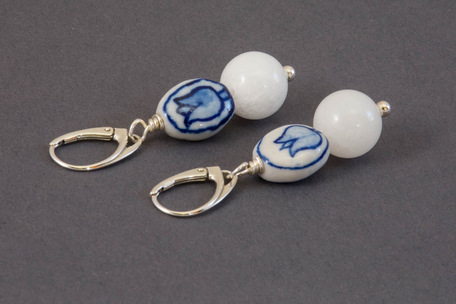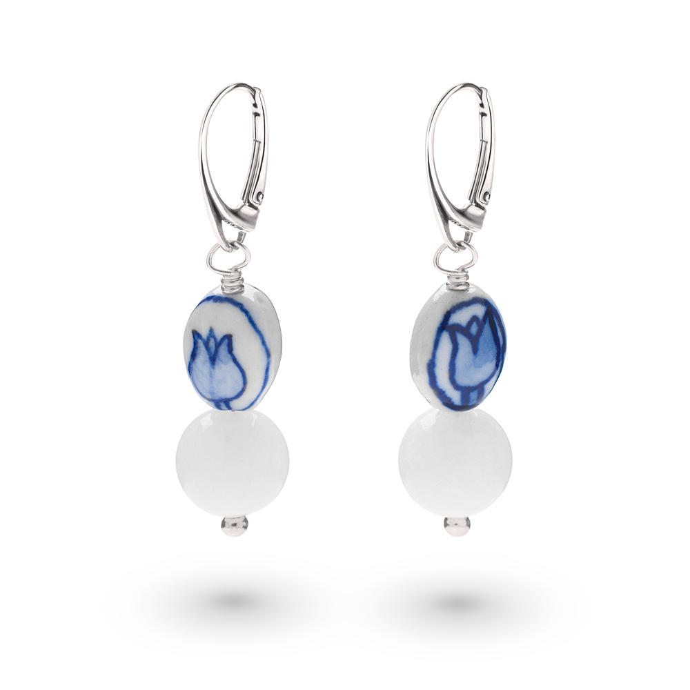 Kolczyki w całości wykonane ze srebra próby 925 oraz kulek agatu 10 mm i ceramiki holenderskiej przedstawiającej tulipany. Wyjątkowa propozycja na polskim rynku.
