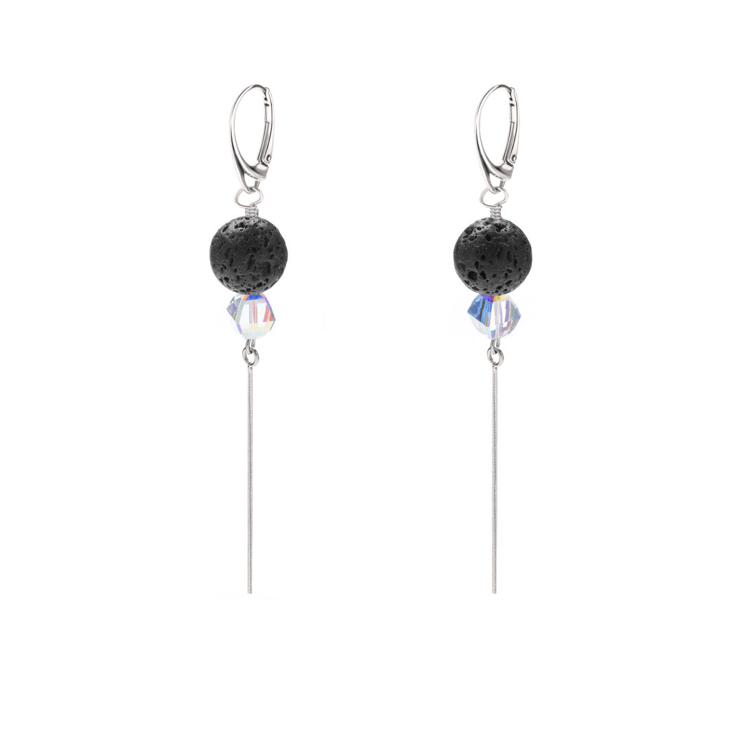 Kolczyki wykonane z kulki lawy połączonej z kryształem Swarovski w kolorze AB, oraz srebrnego, delikatnego łańcuszka. Całość wykonana w srebrze próby 925. Połączenie surowości lawy z elegancją. Idealne na wytworną kolację. Zaintrygują odbijanym światłem.